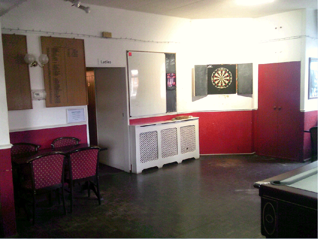 Then to right of the bar: route to eating room & Gents toilets; Ladies toilets; dart board; pool table; another TV - a bit blurred ;-)