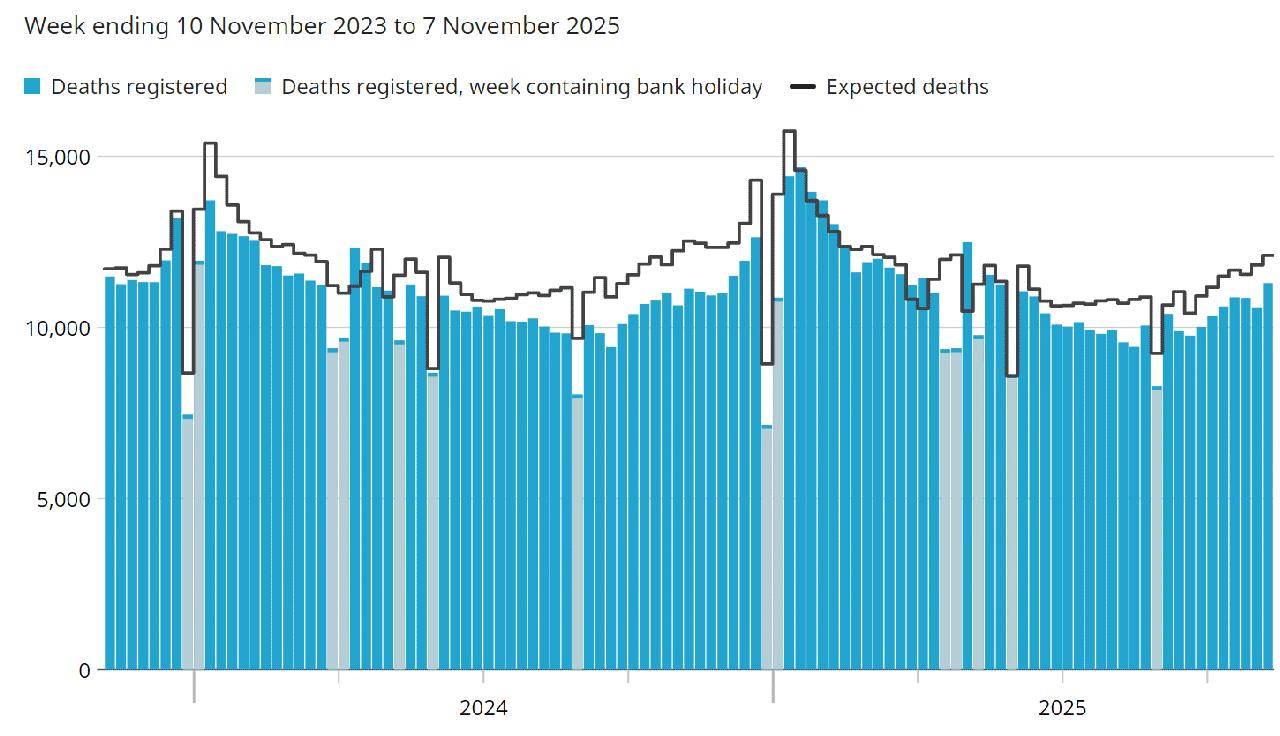 weekly ONS graphs of Total Deaths from April 2020 until Tuesday 24th November 2021.