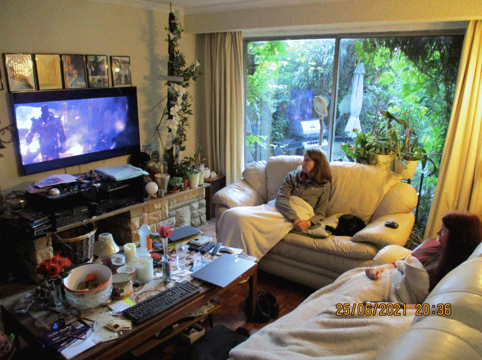 The women are now relaxing: June in Kitchen watching Live Tennis from Eastbourne on Prime & playing Nanogram;