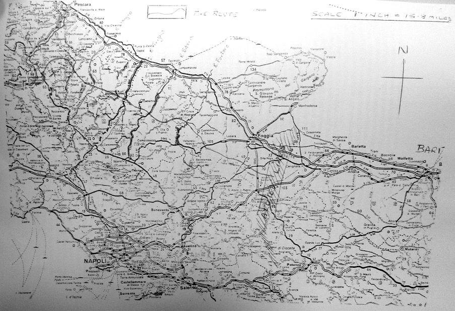 The map overleaf shows our camp at Sulmona and our route to Allied Lines near Foggia. The first part of our journey was through the Maiella mountains over difficult terrain but the mountain people were helpful and friendly. In the mountainous region we did not have to worry about re-capture just survival. After leaving the mountains the going was easier but we could not trust the locals. With the odd Fascist in their midst and placards everywhere putting a price on our heads for information we decided to travel by night. So with the North Star to guide us we made a beeline south east to Foggia or Fog ( with a soft g ) as the locals would have it.