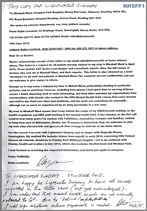 I conceived the idea of writing the letter, and this "Bluebell" document, during my time in Bluebell Ward,