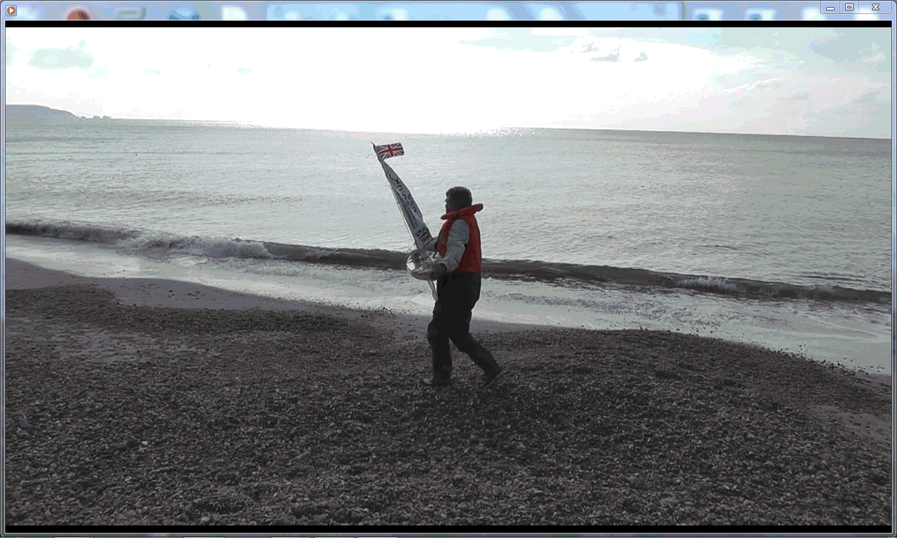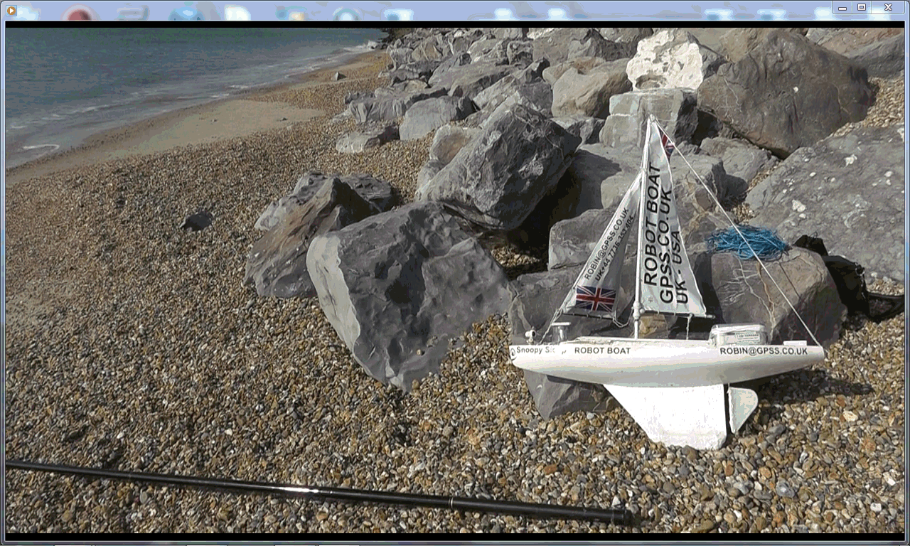 The blog mentions a "Bray Lake Test" : "Friday 14th June: Snoopy was pining for Bray Lake, so he was given a test sail, around the usual "Bray Lake Test" waypoints, in a southerly wind of about 15 to 20mph. As expected, he took ages (45 mins?) to reach the first waypoint, almost directly upwind, but then returned much faster, within maybe 15 minutes, and within a metre of his base." The picture on the right was taken during this test, and a video was put up then. You can play the 2 minute Video of June 2013.