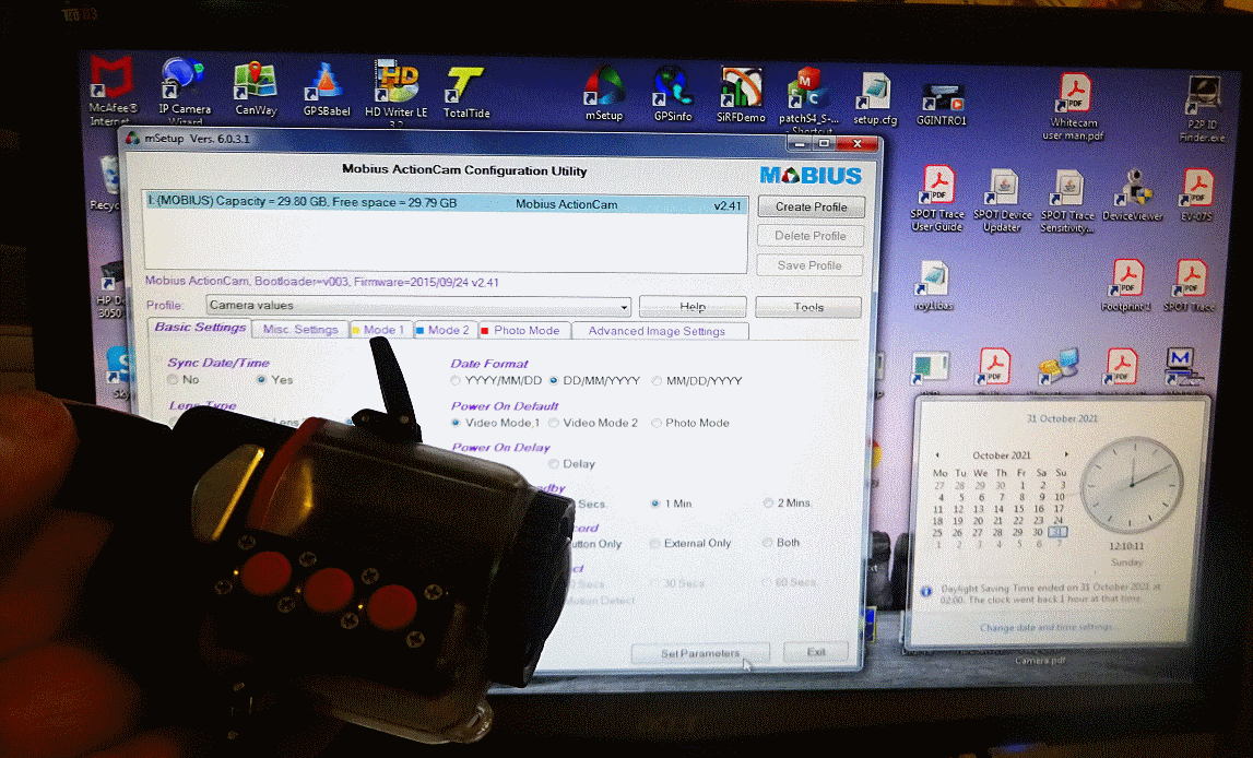 of test equipment to be working: 1) the GPS Logger, that records his GPS track, every second. 2) Mobius video camera, with