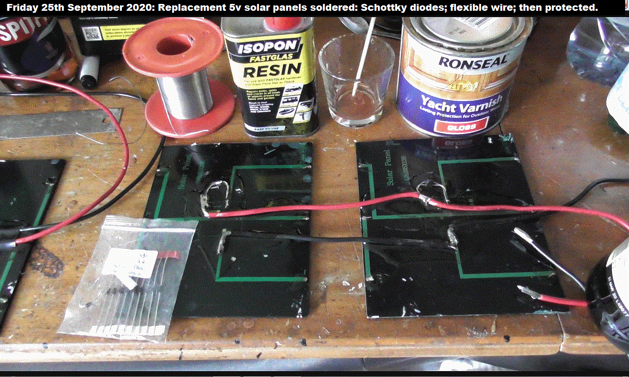 Click on pictures to reveal detail. Four spare 5v "Solar Panel GH165X135" ( from China, years ago ) were soldered: