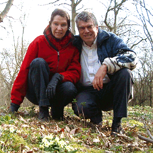 Here we are, pausing on a walk in the woods near us, admiring the wild primroses.
